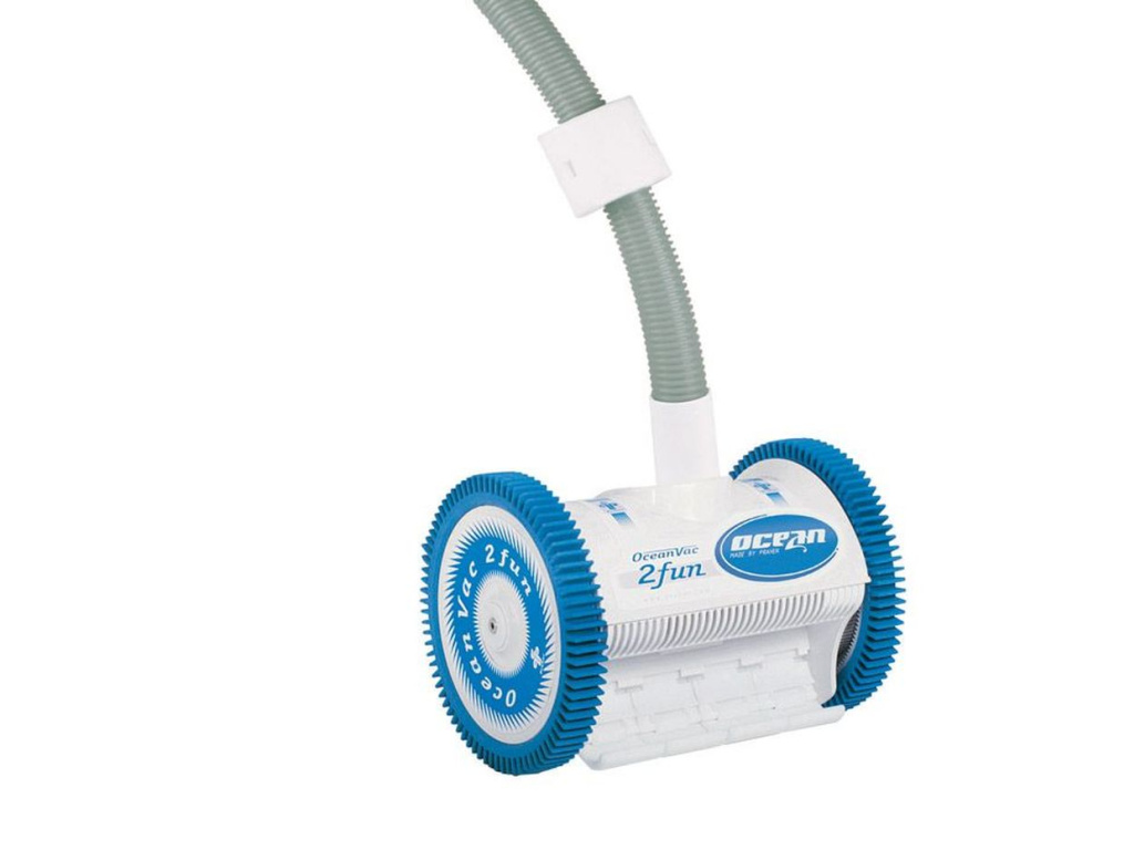 Automatický vysavač OCEAN VAC 4 FUN - Vysavač je určen pro všechny typy bazénů / fóliové, polyesterové, betonové, nerezové / o rozměrech ca 10 x 5 m. Pro optimální pracovní výkon je třeba čerpadlo o výkonu minimálně 8 m3/hod. Při odpovídajícím výkonu čerpadla vyčistí i stěny bazénu. Pracovní šířka je 20 cm. Dle programu mění každých 25 sekund směr pohybu. Díky nové konstrukci sacích klapek nevadí vysavači při pohybu ani dnové výpusti a dnové trysky. Zbaví bazén všech nečistot, včetně písku a listí.