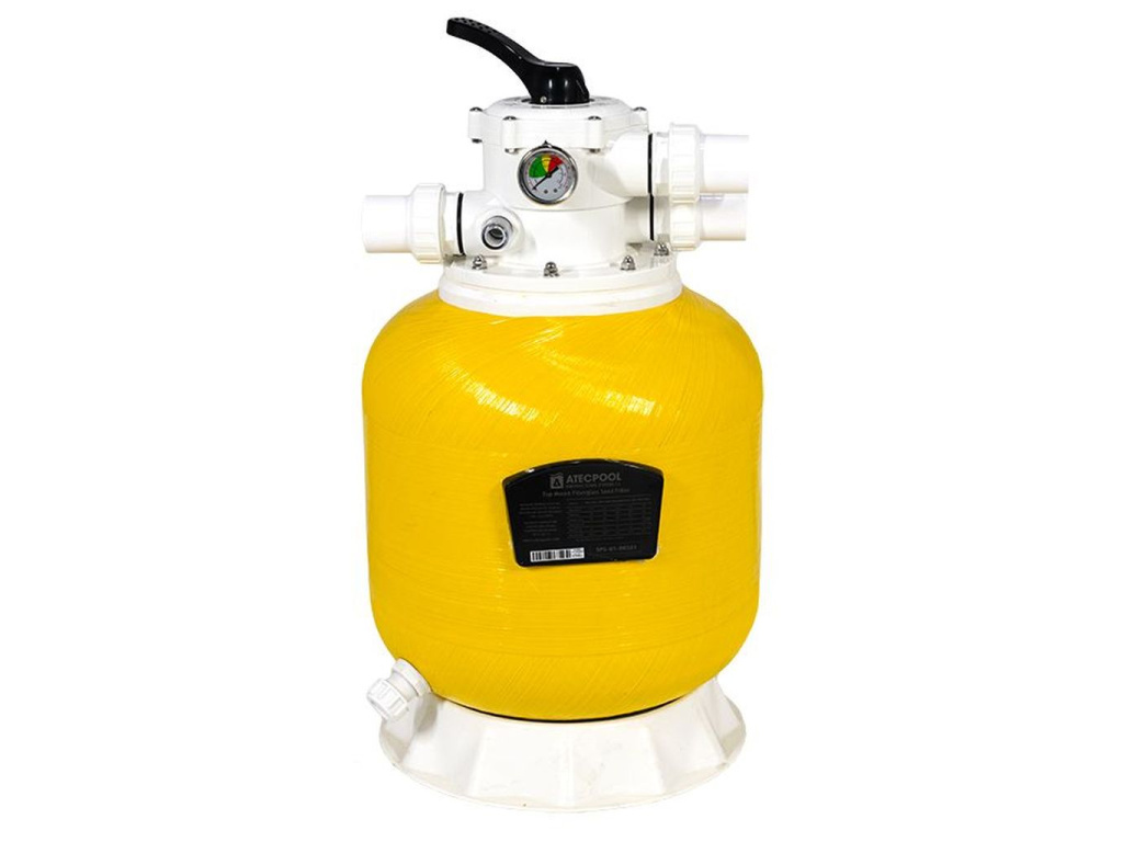 Jednotka bazénové pískové filtrace tvoří srdce bazénové technologie a pomáhá podstatnou měrou udržovat bazénovou vodu v požadované optimální kvalitě. Bazénová písková filtrace ATECPOOL TOP GOLD s horním umístěním šesticestného ventilu špičkové španělské značky plně splňuje veškeré provozní nároky středních a velkých domácích bazénů či hotelových nebo wellness provozů. Jednotku bazénové filtrace tvoří tlaková nádoba, vinutá ze sklolaminátové tkaniny, vnitřní rozvody, šesticestný ventil s robustní černou pákovou rukojetí a manometr s hydraulickou ochranou proti poškození případnými prudkými změnami tlaku ve filtračním loži.