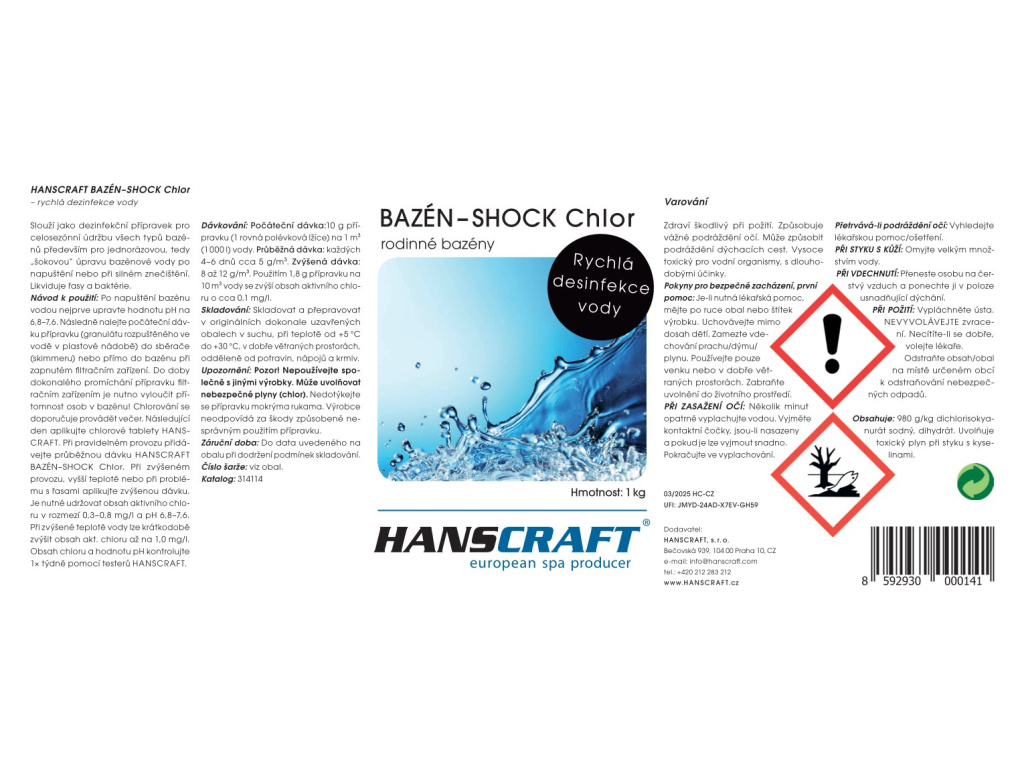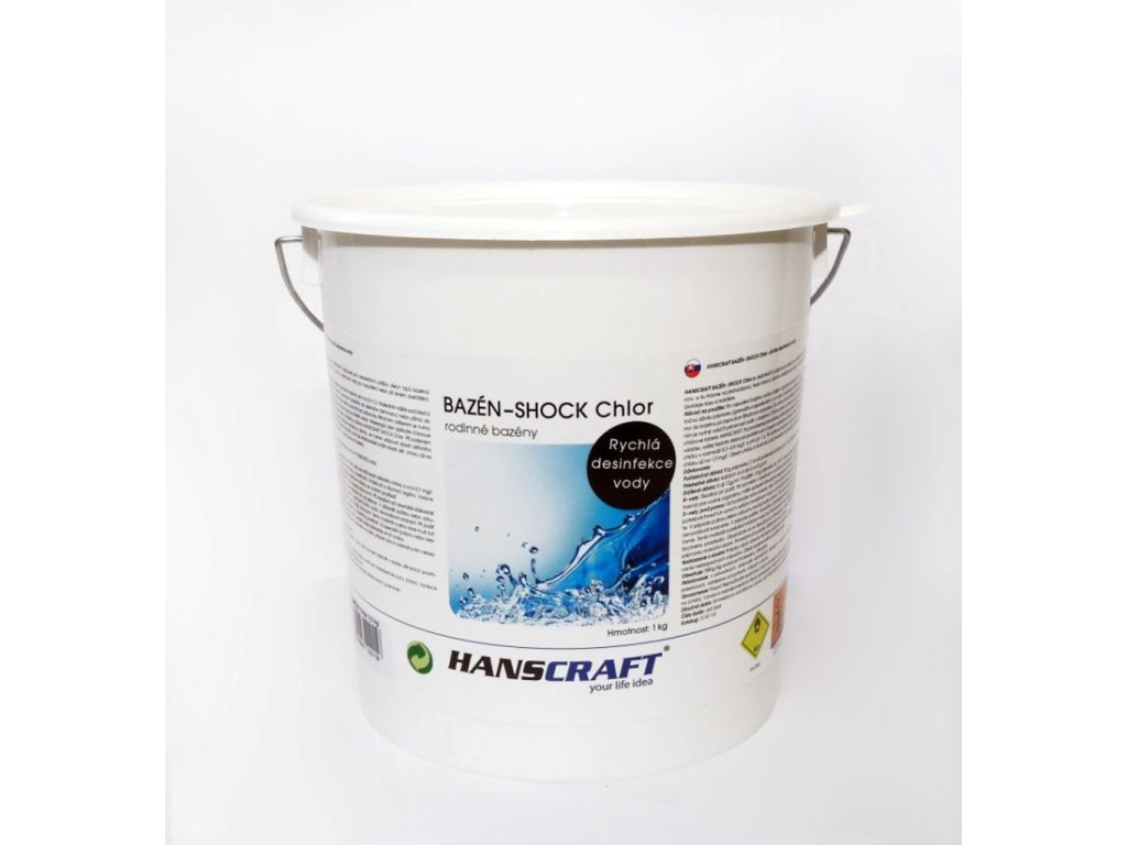 HANSCRAFT BAZÉN - SHOCK Chlor / granulát Šoková - rychlá desinfekce bazénové vody, při zprovoznění bazénu, při extrémních podmínkách provozu (vysoká teplota vody, velký počet lidí v bazénu, nadměrné užívání bazénu, bouřky apod.). Použití přípravku: Při používání chlorových přípravků se uvolňuje chlor a dochází k dezinfekci bazénové vody. dále se likvidují přítomné mikroorganismy, jako jsou řasy a bakterie. Koupající se osoby do bazénu uvolňují nečistoty z pokožky, opalovací krémy apod. Dále do bazénu padají nečistoty z vnějšího prostředí (prach, pyl. výtrusy apod.). Všechny nečistoty v bazénu podporují růst bakterií a řas, je proto nutno dbát na pravidelnou dezinfekci a údržbu. Způsob použití: Dávkujte přímo do bazénu po rozpuštění v nádobě nebo ve skimmeru při zapnuté filtraci. Četnost použití: Při napuštění bazénu rychlá šoková dávka - 10 g/m3 vody (1 rovná polévková lžíce). Při pravidelném provozu - 5 g/m3 vody (1 čajová lžička).