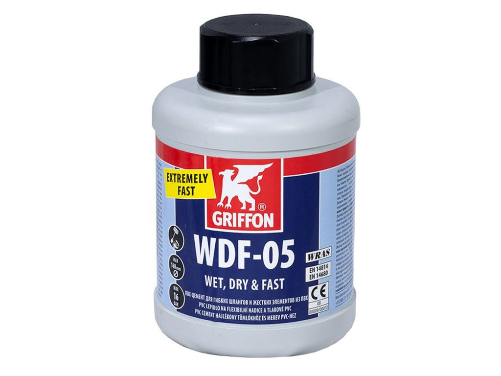 Lepidlo Griffon WDF-05 patří mezi vysoce kvalitní a spolehlivá lepidla pro lepení trubních či plošných spojů veškerých technologií z neměkčeného PVC-U a ABS materiálů, provozovaných ve vlhkém prostředí. Jedná se o špičkové tixotropní (nestékavé) lepidlo blankytně modré barvy, které lze na lepený spoj pohodlně nanášet pomocí štětečku, integrovaného přímo do uzávěru balení. Jedná se o produkt profesionální úrovně, přímo určený pro aplikace ve vlhkém prostředí (vlastní lepení se provádí na suchém a očištěném spoji). Skvělé užitné vlastnosti lepidla Griffon WDF-05 tedy plně využijete při stavbě a kompletaci bazénových technologií, tlakových trubních rozvodů různých druhů vod, zavlažovacích zahradních systémů, flexibilních hadic, technologických okruhů fontán či vodních atrakcí apod. Označení tohoto lepidla – WET, DRY and FAST – není tedy žádnou klamavou reklamou, ale úsporným a zároveň maximálně výstižným shrnutím jeho špičkových vlastností.