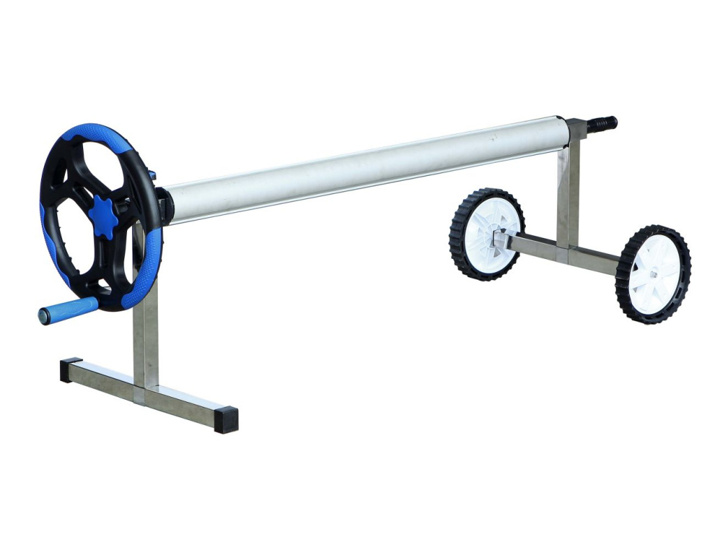 Pojízdný naviják na bazénovou solární plachtu je zhotoven z pevných a kvalitních materiálů jako je nerez, PVC v kombinaci modré a černé barvy a eloxovaný hliník. Díky kvalitní povrchové úpravě je velice odolný proti působení nepříznivých povětrnostních podmínek a mechanické námaze. Pojízdný naviják má stojan z nerezu s dvěma stojinami ve tvaru písmene T. Jedna ze stojin je zaopatřena dvěma pryžovými pevnými kolečky k usnadnění manipulace stojanu při změně pozice. Rozsah možného nastavení středové tyče je od 2,45 m do 6,45 m. K navíjení či odvíjení solární plachty je určeno elegantní černomodré PVC kolo s masivní rukojetí. Jeho náboj z trvanlivého kovu usnadňuje plynulý a snadný chod navijáku. Solární plachta se upevňuje na eloxovanou hliníkovou trubku pomocí osmi pružných gumových lanek s plastovými koncovkami, z nichž jedna se zasouvá do žlábku v centrální tyči navijáku, a druhá se provléká otvorem v bazénové solární plachtě.