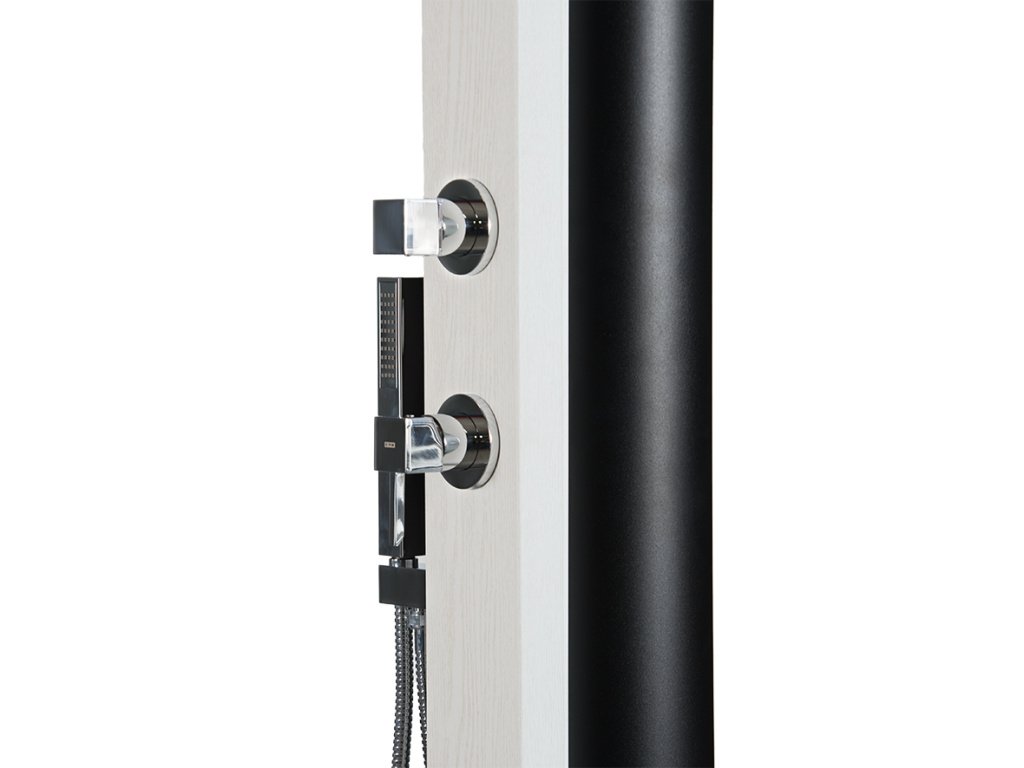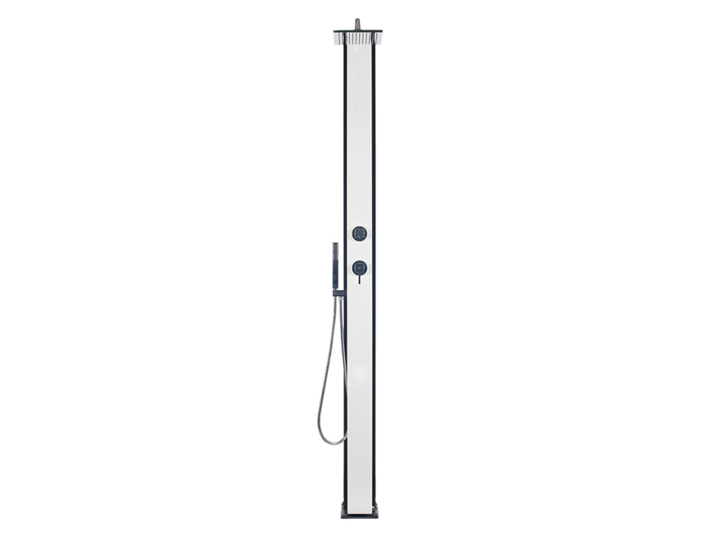 Hliníková solární sprcha o objemu 40 litrů. Přední část je vyrobena z pozinkované oceli s povrchovou úpravou dřeva - bilý dub a šířkou 112 mm. Obsahuje jednopákovou baterii s obdélníkovým designem z pochromované mosazi. Rozměr sprchové hlavice je 200 x 200 mm. Tento model je bez oplachu nohou.