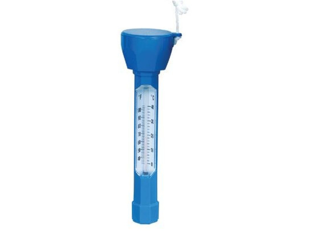 Bazénový teploměr v modré barvě, který snadno upevníte provázkem ke schůdkům.