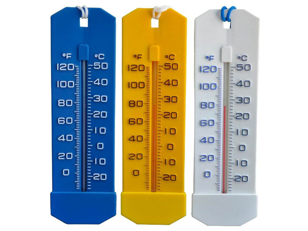 Závěsný plochý teploměr s provázkem je vyroben z kvalitního plastu v moderních pastelových barvách – bílé, modré nebo žluté. Teplotní stupnice je velmi dobře čitelná, jednotlivé značky a popisy jsou plasticky vyvedeny v kontrastní barvě, takže informaci o aktuální teplotě vzduchu získáte i z větší vzdálenosti. Jedná se o univerzální teploměr, který je možné použít i pro měření teploty bazénové vody, jen je třeba zohlednit skutečnost, že teploměr sám o sobě neplave na hladině, takže je nutné jej při měření teploty vody buď držet v ruce, nebo upevnit pomocí provázku z umělého vlákna k bazénovým schůdkům či okraji bazénu.