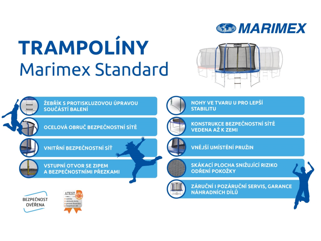 Trampolína Marimex Standard je skvělým doplňkem každé zahrady. Děti skákání na trampolíně milují a při skákání si snadno zacvičí i dospělí - nosnost je až 150 kg. Dokonalou stabilitu zajišťují tři nohy ve tvaru písmene U.
