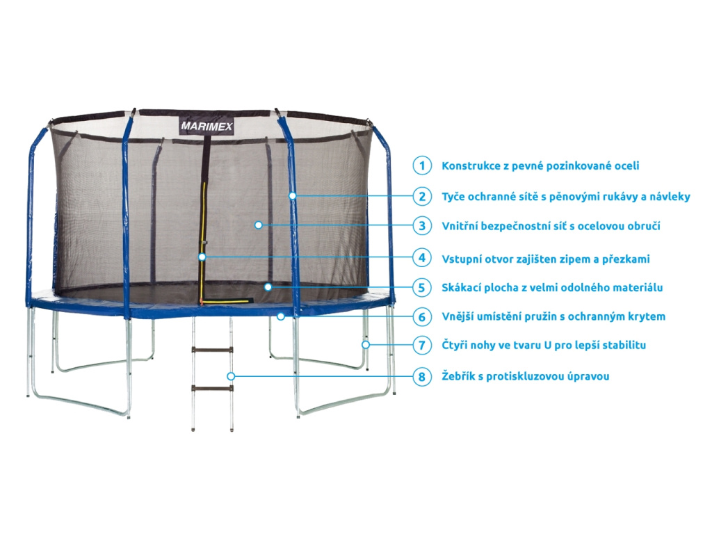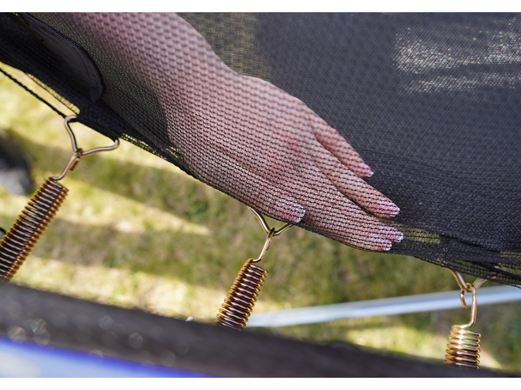Vnitřní ochrannou síť najdete přímo v balení, nemusíte si ji dokupovat zvlášť. Vnitřní ochranná síť je bezpečnější než vnější síť - brání přístupu skákajícího do části s pružinami. Vstupní prostor je zajištěn třemi přezkami a brání vypadnutí. Tyče jsou obaleny ochranným návlekem z měkčené pěny. Nohy trampolíny jsou samostatné a zvyšují stabilitu celé trampolíny. Spojení tyčí nohou trampolíny a sítě je jištěno speciálními sponami.