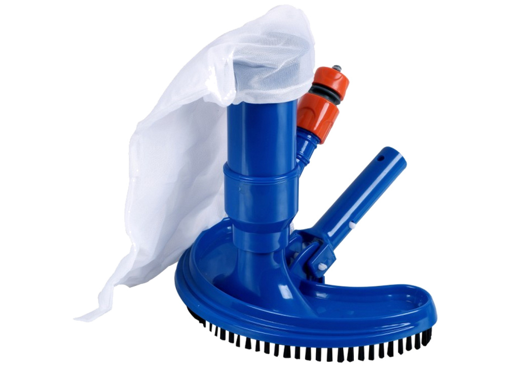 Bazénový vysavač se záchytným sáčkem z hustě tkané textilie nevyžaduje ke svému provozu připojení na bazénovou filtraci, ale pouze na rozvod tekoucí vody (zahradní hadice). Díky tomu je možné tento malý kompaktní vysavač používat k odstranění usazených nečistot na stěnách či dně malých domácích bazénů, dětských koupacích bazénků či zahradních van, sloužících pro rychlé osvěžení v parném létě. Na tělo bazénového vysavače se připojuje pomocí rychlospojky zahradní hadice a z ní tekoucí voda strhává svým proudem nečistoty do záchytného sáčku. Černé štětinové kartáčky, umístěné v jedné řadě po obvodu hlavy vysavače, dobře stírají usazené nečistoty. Bazénový vysavač se záchytným sáčkem je možné díky standardnímu držáku připojit k běžné bazénové teleskopické tyči (vyjma tyče kód 2447). Záchytný sáček z bílé, hustě tkané textilie, je možné v případě potřeby opakovaně vyprat pod tekoucí vodou a nechat oschnout.